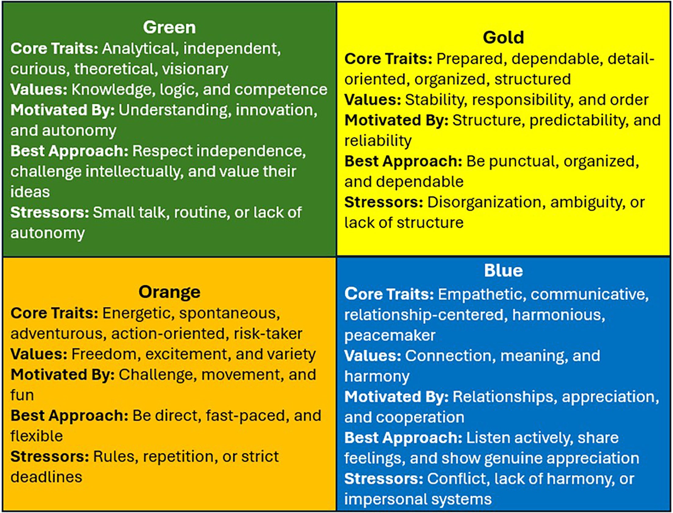 Summary of the True Colors personality framework illustrating four primary personality types (Blue, Gold, Orange, and Green), each defined by distinct core traits, values, motivators, and stressors. The framework highlights how individual differences shape communication, decision-making, and collaboration styles.
