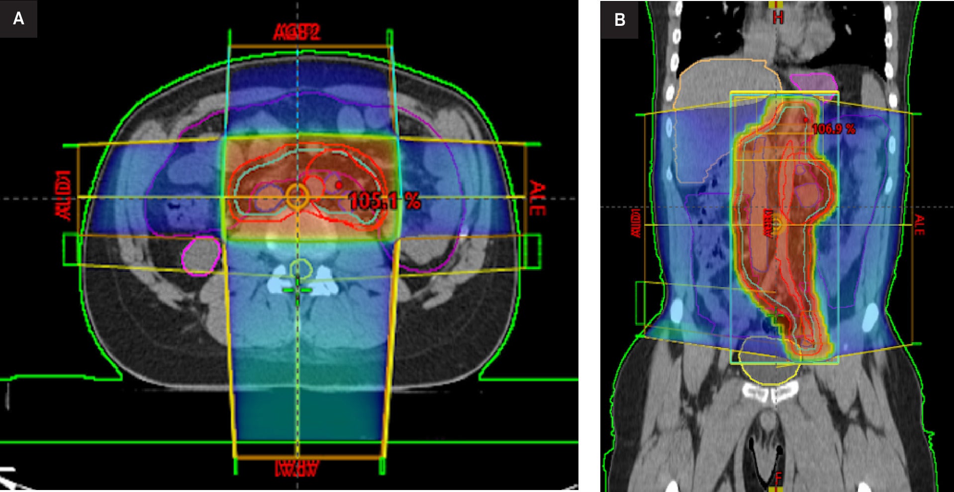 External beam radiation therapy treatment planning. Axial (A) and coronal (B) CT images with overlaid dose distribution and target volume (green outline).