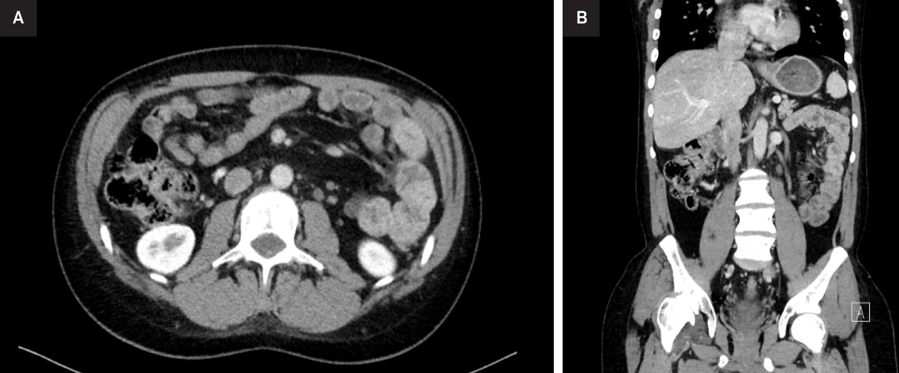 Thoraco-abdominal-pelvic CT. axial (left, A) and coronal (right, B) images demonstrate a retroperitoneal left para-aortic lymphadenopathy, located below the renal vein, measuring 20 mm.